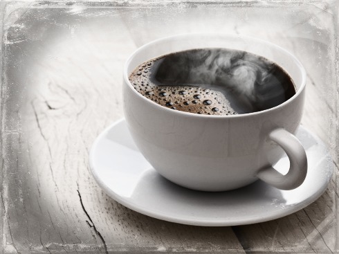 Cup of hot coffee on an old wooden table.